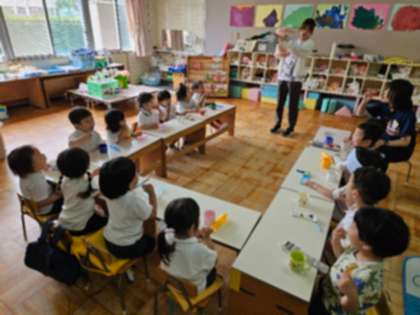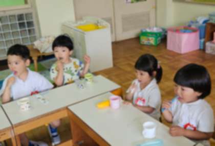6月になり、あか組(3歳児)も歯磨きが始まりました。養護教諭に歯の模型を使って歯の磨き方を教えてもらい、音楽に合わせながら自分で頑張って磨いていました。