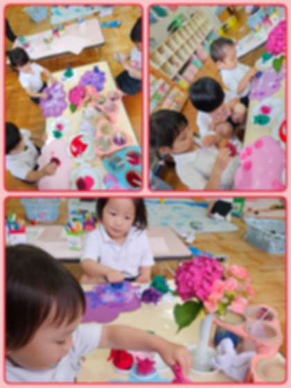 幼稚園に咲いていた紫陽花を見ながら、タンポという道具を使って紫陽花をつくりました。