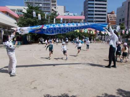 子どもたちがつくったこいのぼりの下で、幼稚園のみんなで体を動かして、「子どもの日の集い」をしました。