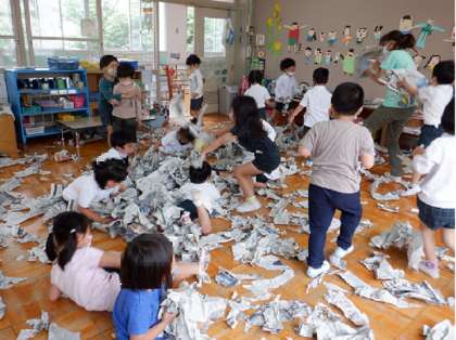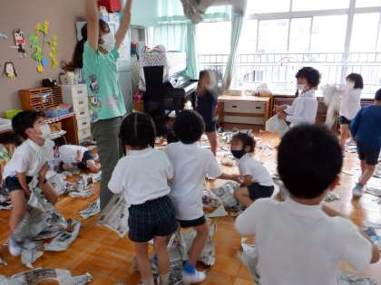 新聞をびりびり破って遊びました。