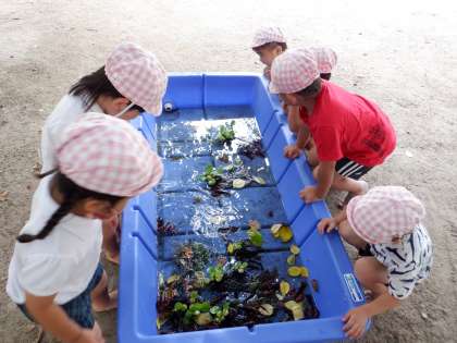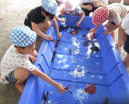 ザリガニが幼稚園にやってきて、子どもたちは大喜び!!