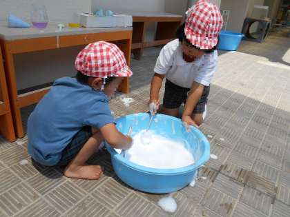 ぐるぐるまぜまぜ 公開日 2022/08/17 更新日 2022/08/17 西中島日記 泡だて器でぐるぐるぐるぐる… 頑張って混ぜて泡ができると、「ふわふわだ〜」「触ってみて」と、嬉しそうです。 砂や水、泥とはまた違う感触が面白いと感じています。 いいね(0)