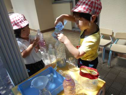 色水を見て、「きれい!」と、驚いている子どもたち。
