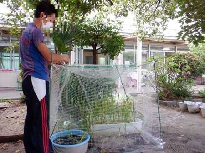 お米の稲を守るために、事業担当主事さんがお米の周りにカバーをつけてくれました。