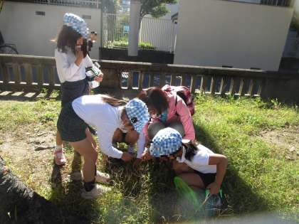 草むらにはバッタが!よく見て探しました。バッタを見つけると嬉しい!見つけたバッタを虫かごに入れ、嬉しそうに見せに来る姿が見られました。