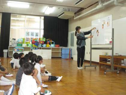 10月の保健指導は、そら組・さくら組では「けがの手当てについて」あか組では「けがの予防について」を話しました。
