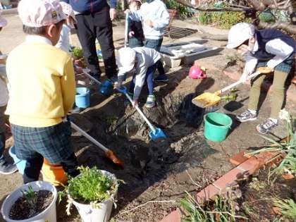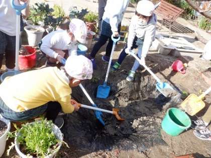 前日から、子ども達は、「この池の中に恐竜がいるんだ」と池をスコップでかき混ぜたり、水を出したりして遊んでいました。恐竜がいないなとなり、「じゃ、今から池を工事しようか」と誘うと大喜び!!