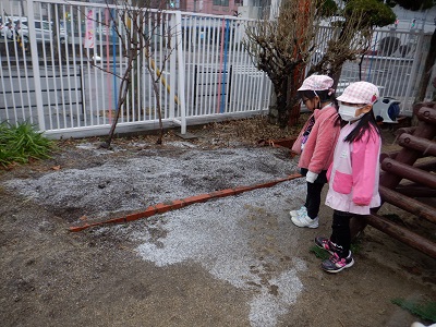 雪が降ってきたよ 公開日 2023/02/02 更新日 2023/02/02 西中島日記 保育室の窓から雪が降っているのを見て 「先生、雪が降ってる!」「雪触りたい」と、雪が降る中園庭を走りまわって雪を見たり、 すべり台に積もっている雪を集めたりしていました。 園庭にある畑がうっすら白く積もっており、「どうしてここは雪が積もるのかな」と不思議そうに見ていました。 大阪では、なかなか雪を見る機会が少ないため、冬の季節を感じるよい経験となりました。 いいね(0)