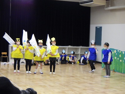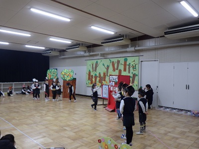 子ども達の劇遊び、楽器遊びや合奏を保護者の方に見てもらいました。