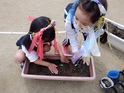 スナップえんどうの芽がでてきたので… 公開日 2023/03/20 更新日 2023/03/20 西中島日記 スナップえんどうの種をまいて、芽が出たので、黒ポットからプランターに植えかえました。 黒ポットを反対にして、土がこぼれないようにそっと植えました。 「早く食べたいね」と楽しみにしています。 いいね(0)