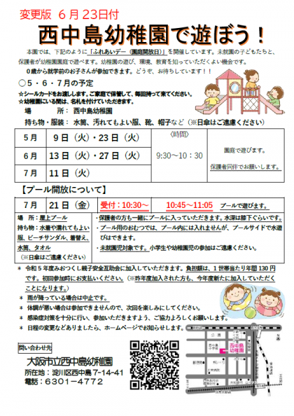ふれあいデーのお知らせ! 公開日 2023/06/23 更新日 2023/06/23 お知らせ 7月21日のふれあいデーの時間が変更となりましたのでお知らせします。 10:30〜受付開始、10:45〜11:05までプールで遊びます。 水着や濡れても良い服、タオル等をお持ちください。更衣室で着替えていただきます。 次回のふれあいデーは、6月27日火曜日です!たくさんのご参加お待ちしてます! いいね(0)