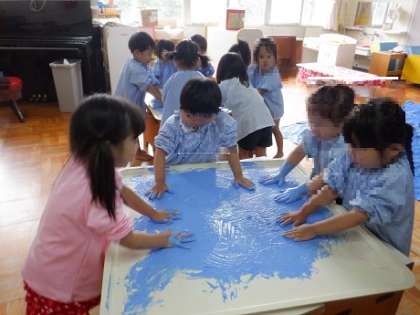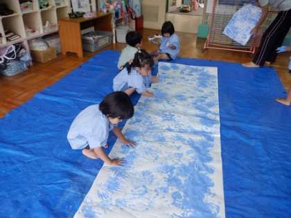 絵の具のお水は冷たいかな?ぬるいかな?みんなでピチャピチャ、バチャバチャと、かき混ぜました。