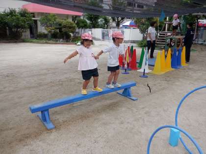 一学期には、先生と手をつなぎ渡っていた、平均台の一本橋を、「一人でできるよ」と、挑戦しているあか組の子ども達です。「一緒に行こうよ」と、友達と手をつなぎ、お互いに支え合う姿が微笑ましいです。