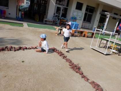 子どもたちは、「これ、モグラみたい!」「5人家族のお芋だよ」「いくつあるかなあ」と、大喜びで、並べ始めました。
