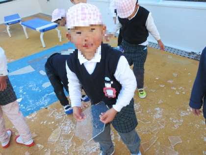 つるつる滑る氷を一生懸命に持ち上げ、「鏡みたい!」「顔が見えるよ!」と喜んでいましたよ。