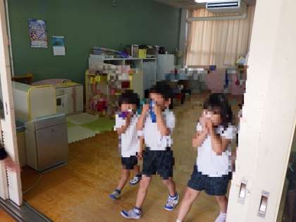 預かり保育で避難訓練をしました。保育室で遊んでいる時に、保健室から火事が起きた想定で園庭に避難しました。火事の時の避難の仕方を思い出して、鼻と口をハンカチで押えて、先生と一緒に落ち着いて避難することができました。