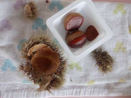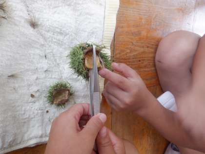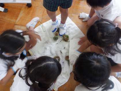 くり、みーつけた! 公開日 2025/09/19 更新日 2025/09/19 西中島日記 園庭に色付いたいがぐりが落ちていました。 「何個入っているのかな?」「あけてみよう!」と挑戦する子どもたち。触ると、「痛い!」の声。靴や軍手、タオルを使って工夫しながら取り出し、最後はピンセットで小さな栗も見つけました。秋の実りにワクワクしながら、友達と知恵を出し合う姿が見られました。 いいね(0)