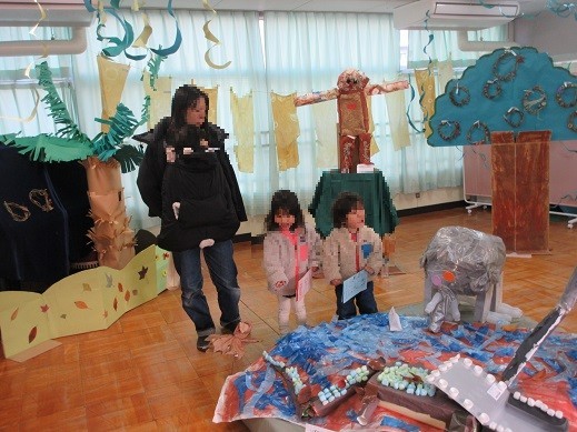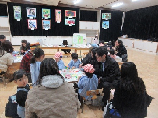 子どもたちの思いあふれる絵画や作品を展示し、作品展を行いました。当日はカレンダー製作も行い、子どもたちと保護者の方が一緒に楽しむ姿が見られました。作品展には、西中島小学校のお兄さんお姉さんと先生方、未就園児さんなど、たくさんの方が来てくださいました。子どもたちが「これな!僕つくってん」と自分の作品を嬉しそうに伝えるだけでなく、「これ○○ちゃんが作ってん。やですごいやろ」と友達の作品を紹介し認める姿が多々見られました。自分だけでなく周囲に目を向け、友達の良さを伝えようとする姿に心の成長を感じました。