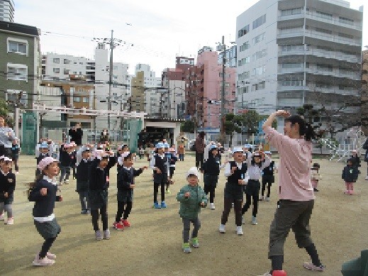 3歳児4歳児も園庭に出てきたのでみんなで一緒に体操をしました。