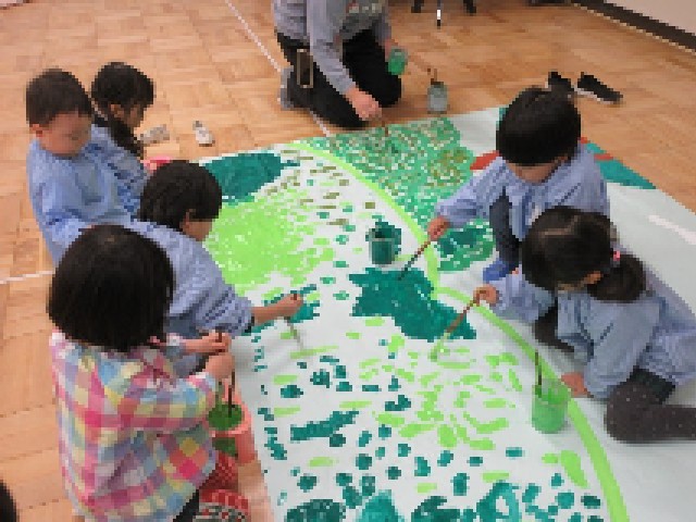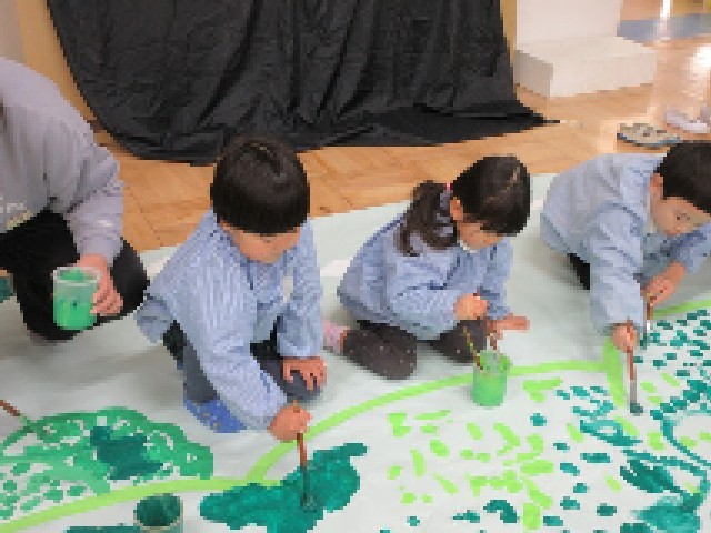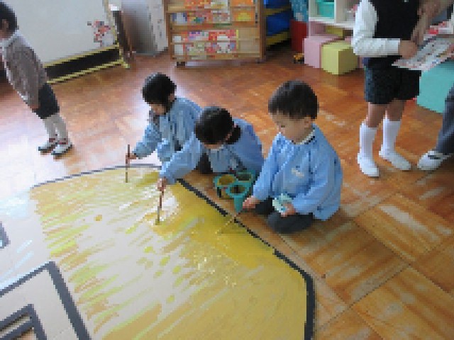 劇遊びに使うお家と背景の色塗りをしました。いつも絵をかいている画用紙より大きな紙だったのでみんな驚いていました。