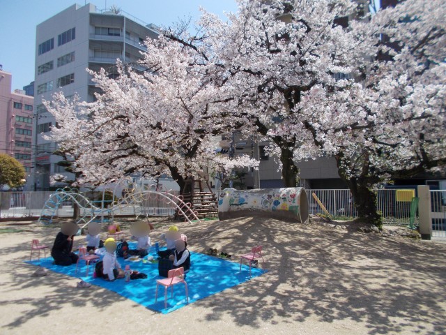 満開の桜の木の下で、「にこにこ(預かり保育)」のみんなでお弁当を食べました。