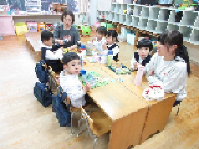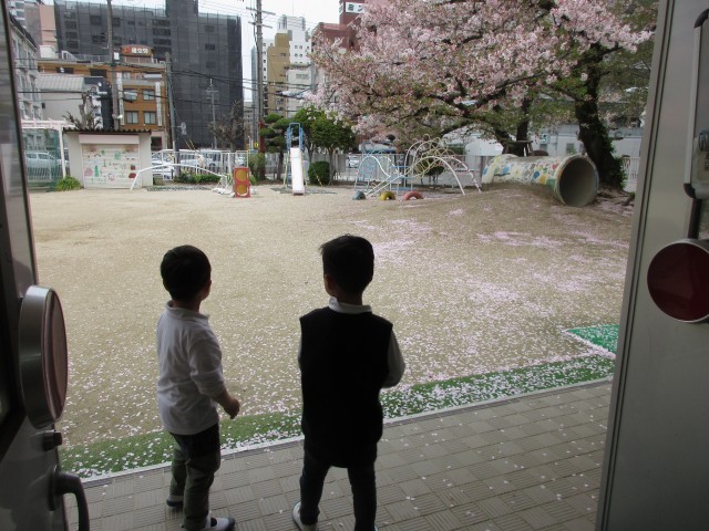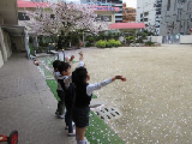 保育室の中から外を見ると、風で桜の花びらが舞っていました。それを見た子ども達は、「ゆきざくらだ!」「今度は波みたい!」と入り口に集まり楽しそうに眺めていました。しばらくすると、飛んできた花びらを集めて、のかけ声!」の掛け声でみんなで花吹雪を楽しんでいました。