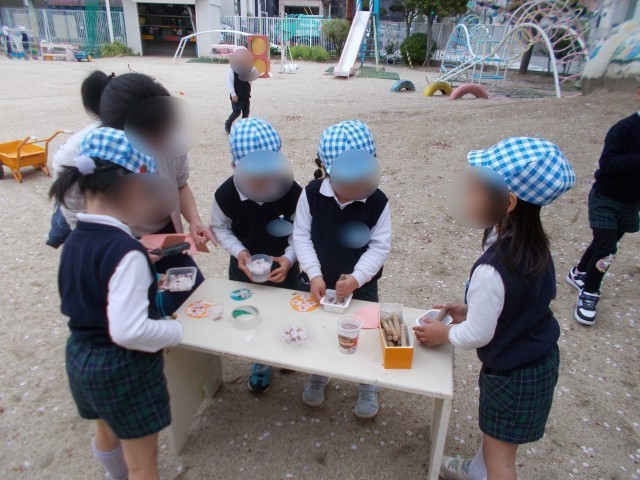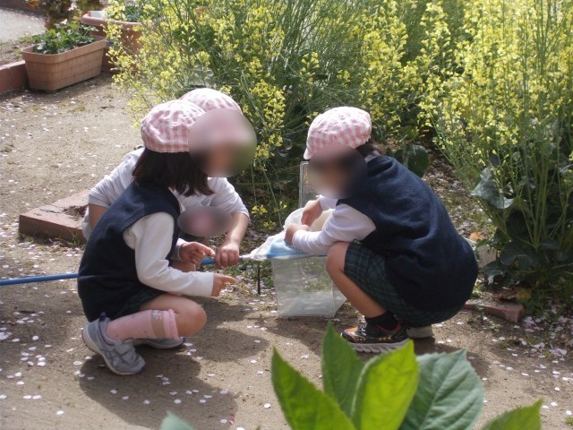 虫探しをしたり、桜の花びらを集めて飾りをつくったり、桜の花びらで色水をつくろうとしたりして遊んでいましたよ。
