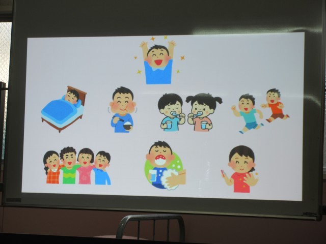 「朝ご飯は食べたほうがいい?」「どうして歯みがきしないといけないの?」などと質問をしながら話を進めました。