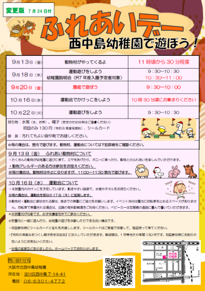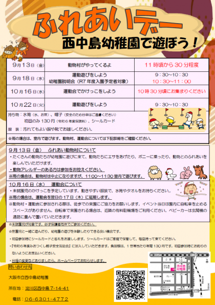 9月、10月のふれあいデーの日程が決定しました。 動物と触れ合ったり、運動会でか...