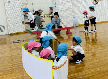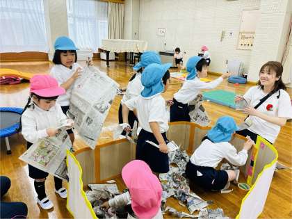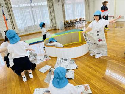 プレイルームで遊んでいた子どもたち。しばらく遊ぶうちに、サークルをお家に見立てて、「おおかみと七匹のこやぎ」ごっこが始まりました。そして、またしばらく楽しんだ後、今度は「温泉をつくりたい!」とみんなで新聞紙をいっぱいちぎってお湯に見立てて、温泉ごっこの遊びが展開されていきました。楽しかったね。