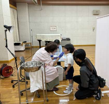 事前に養護教諭から検診に使う歯鏡を見せてもらったり、どんなことをするのか知らせてもらったりしていましたが、実際に行うとなると緊張気味の子どももたくさんいました。終わった後は、ホッとした様子で、頑張って泣かずにできたことを嬉しそうに話していました。