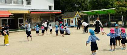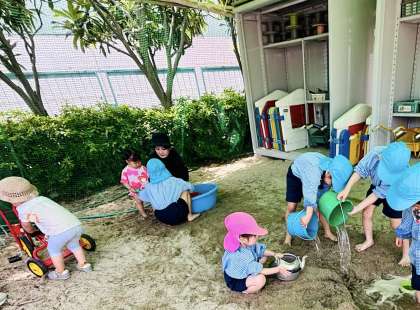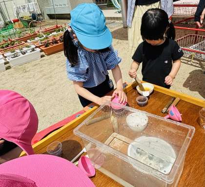 今日も小さいお友達が遊びに来てくれて大喜びの子どもたち。自分たちが日頃楽しんでいる色水遊びを教えてあげたり、一緒に泥遊びをしたり、音楽に合わせて体操をしたりしました。初めて来てくれたお友達もいて嬉しかったね。