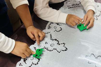 少し前からカエルの飼育を始め、カエルに親しみ始めた子どもたち。今日は、5歳児が折紙でカエルを折ることに挑戦し、できたカエルを誇らしげに見せて、「ぴょんって跳ぶよ」「16回も折るの大変だったよ」と誇らしげに話していました。