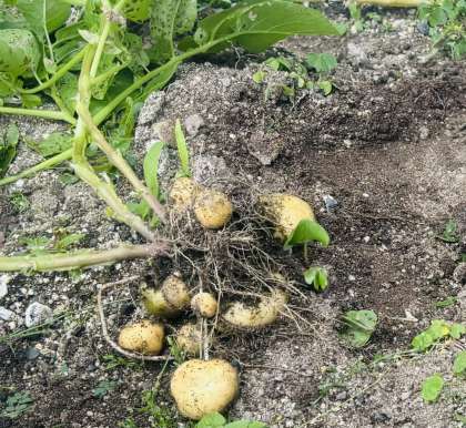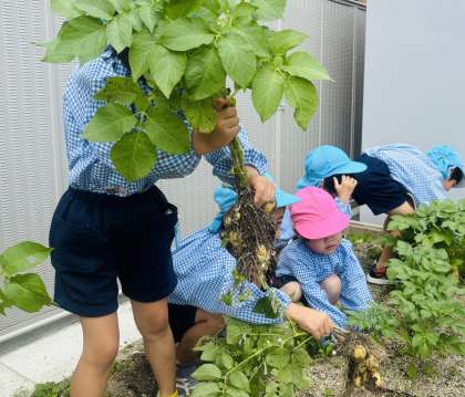 昨日、幼稚園の畑でジャガイモ掘りをしました。緑の茎を引っ張ったり、土を掘ったりすると、たくさんのジャガイモが出てきました。収穫後は、形や大きさを比べたり、並べたり、数を数えたりした後、5歳児が仲良く持ち帰られるように考えて分けてくれました。