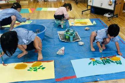 今日は、5歳児がジャガイモ掘りで心が動いたことを大きな画用紙に絵の具でのびのびとかいていました。