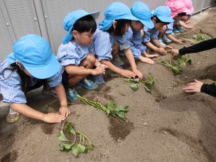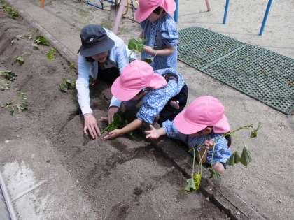 「どんな種かな?」と種まきを想像する子どももいましたが、サツマイモの苗は、根が無く、茎や葉のみ。「どこにサツマイモできるんだろう?」と不思議そうにしながらも、寝かせて土を被せて…と苗を大切に扱って植える姿が見られました。