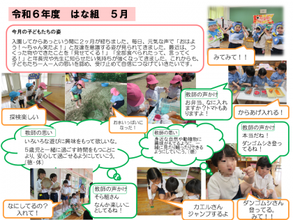 身近な自然に触れたり、クラスや異年齢の友達と過ごすことを楽しんだり、体を十分に動かして遊んだり…いろいろな遊びをし、「楽しいな」「面白いな」「もっとしたい!」と心を動かす姿がたくさん見られた、5月の子どもたちの姿です。