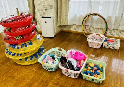 天候不良で延期していたプール遊びが、いよいよ始まりました。初めに安全のための約束事を聞いた後、みんなで水鉄砲の水をとばしてプール遊びの始まり始まり。水の中で楽しく遊びながら、水に親しんでいけるようにします。