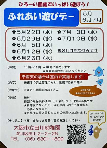 明日はふれあい遊びデー 公開日 2024/07/09 更新日 2024/07/09 幼稚園日記 明日は、1学期最後のふれあい遊びデーです。天候不良の場合は,室内で実施します。初めての方も大歓迎。ぜひ遊びに来てください。 いいね(0)