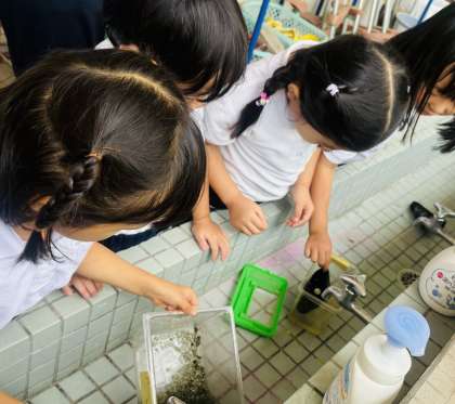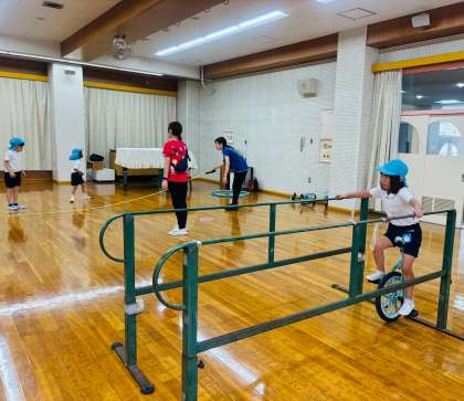 5歳児は、広いプレイルームで、一輪車や縄遊びを楽しんだり、昨年度から継続して飼育しているザリガニのお世話をしたりしていました。