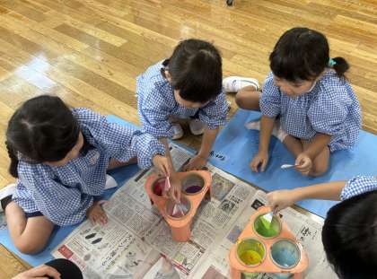 4歳児は、大好きな絵の具を使って染紙をしたり、保育室や廊下に体を動かして遊べるコースをつくって繰り返し楽しんだりしていました。