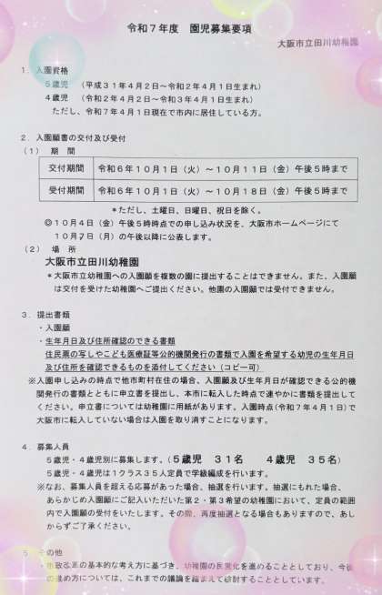 〇入園願書受付期間 10月18日(金)午後5時まで