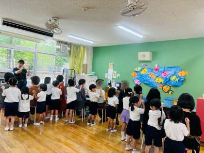 今日は、園児の祖父母を幼稚園に招いて、敬老の集いを行いました。子どもたちは、玄関でおじいちゃんおばあちゃんが来てくれるのをうれしそうに出迎えた後、保育室に案内し、一緒に遊んだり、歌をうたったりしました。肩たたきと手づくりうちわのプレゼントも喜んでもらえて、みんながニコニコ顔の一日でした。ありがとうございました。