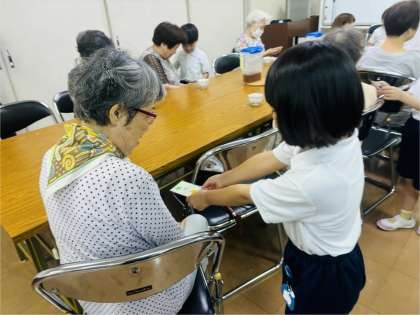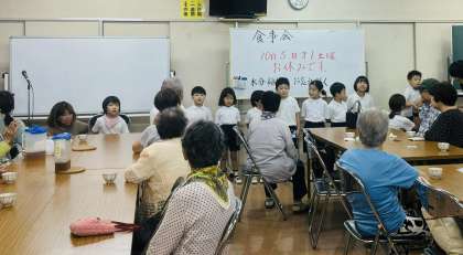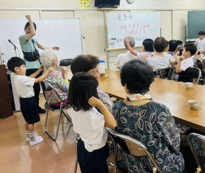 5歳児が、福祉会館で行われた『ふれあい食事会』を訪問し、地域の方と交流をしました。歌を聞いてもらった後で、肩たたきをすると「気持ちいいわあ」「ちょうどいい感じ」と言っていただき、大喜びの子どもたちでした。子どもたちが手づくりしたマグネットのプレゼントも渡し、いつもありがとうの気持ちも伝えることができました。これからも、よろしくお願いいたします。