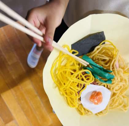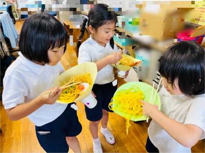 預かり保育に参加している子どもたちが、職員室にやって来て、「ラーメンできたよ」と紙や毛糸でつくったラーメンをうれしそうに見せてくれました。食べるまねをしたり、いろいろな具について説明をしたりして、大はしゃぎの子どもたちでした。預かり保育時間も、工夫して、様々な楽しい遊びを行なっています。