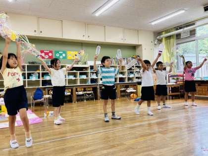 5歳児が、クラスみんなで踊るダンスの振り付けを考えています。友達と考えを出し合ったり、伝え合ったりを繰り返しながら、少しずつ決まってきています。自分たちで考えたからこその楽しさも味わっています。