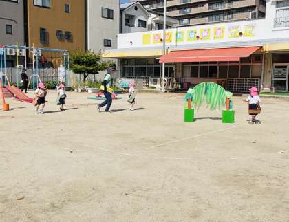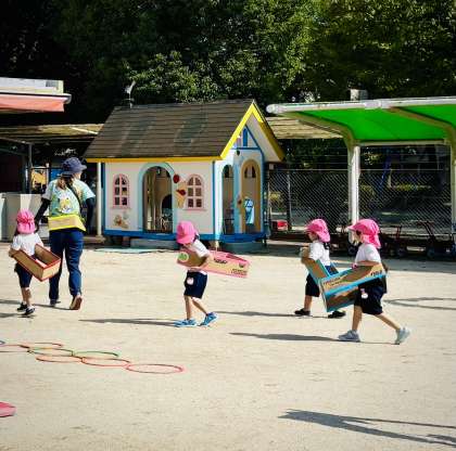 4歳児は、ダンボールでつくったバスに乗って、いろいろなところに出かける遊びを楽しんでいます。遊びの中に、走ったり踊ったりする楽しさを味わうことや、平均台などに挑戦すること、友達を応援することなどを経験できるような工夫をしています。
