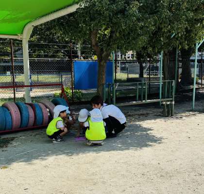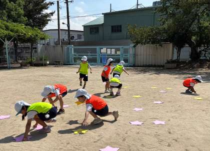 5歳児は、チーム対抗でのカードめくりをしていました。始める前には、チームの友達と作戦会議をして、どうやったら勝てるかなと、相手チームに気づかれないように考える姿がありました。勝負の後、作戦が成功したと喜ぶチームもありました。今日は、2回戦まで行い、1勝1敗で引き分けでした。