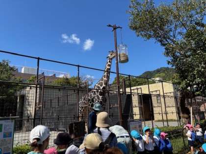 今日は、保護者も一緒に王子動物園へ行きました。ゾウ、キリンなどの動物を間近に見ることができ、子どもたちも大人たちも大喜びでした。感じたことや気づいたことを、家族や友だちや先生たちに伝えようとする姿が、たくさん見られました。心を動かす体験を一緒にしたり、驚きや感動を共有したりすることができた一日でした。