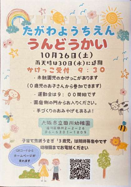 運動会のご案内(未就園児) 公開日 2024/10/24 更新日 2024/10/24 幼稚園日記 10月26日(土)の運動会に幼稚園入園前の小さなお友だちの種目として、「かけっこ」を行います。予約不要、初めて来られる方も大歓迎です。 いいね(0)